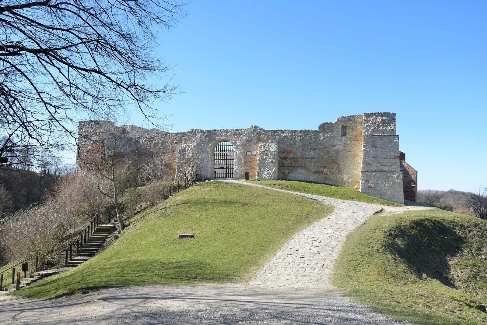 Zaraz po sąsiedzku, obok Góry Trzech Krzyży, na najwyższym wzgórzu Kazimierza Dolnego, znajdziecie ruiny tutejszego zamku. Mimo, że po średniowiecznym zespole obronnym pozostało tutaj niewiele, to warto skierować tu swoje kroki. Na miejscu są skromne resztki murów oraz wieża, która zwana jest basztą. Wieża od zamku jest oddalona o 200 metrów. Wejście na teren zamku w Kazimierzu Dolnym jest płatne. W wakacje 2021 było to 10 pln. Pamiętajcie, że kasa jest tylko przy ruinach. Bilet zakupiony w tutejszej kasie upoważnia do wejście również na basztę. Przy wieży jest tylko punkt kontroli biletów.